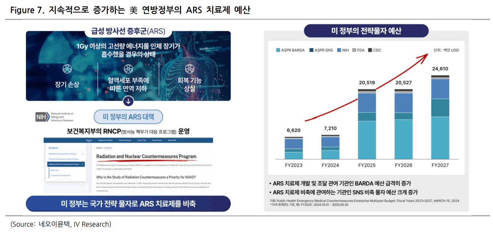 동사는 NT-I7의 급성방사선증후군(ARS) 적응증 승인을 FDA Animal Rule에 따라 추진 중이다. Animal Rule은 방사능 등 인체 임상이 불가능한 치명적 노출 상황에서 동물실험 결과만으로도 승인을 받을 수 있도록 한 특별 규정으로, NT-I7은 이 요건을 충족한다. 원숭이 실험 1단계에서 유의미한 생존 개선(+43%p)을 입증하고 곧바로 Pivotal 임상을 위한 FDA와의 사전협의에 착수했다. 해당 Pivotal 실험을 2026년 내 완료하고 곧바로 FDA 품목허가 신청을 목표로 하고 있다. 이러한 빠른 속도의 개발 일정은 ARS 대응 약물이 국가 안보적 차원에서 긴급히 요구된다는 점과, NT-I7의 전임상 결과가 긍정적이라는 점이 반영된 것으로 판단된다.