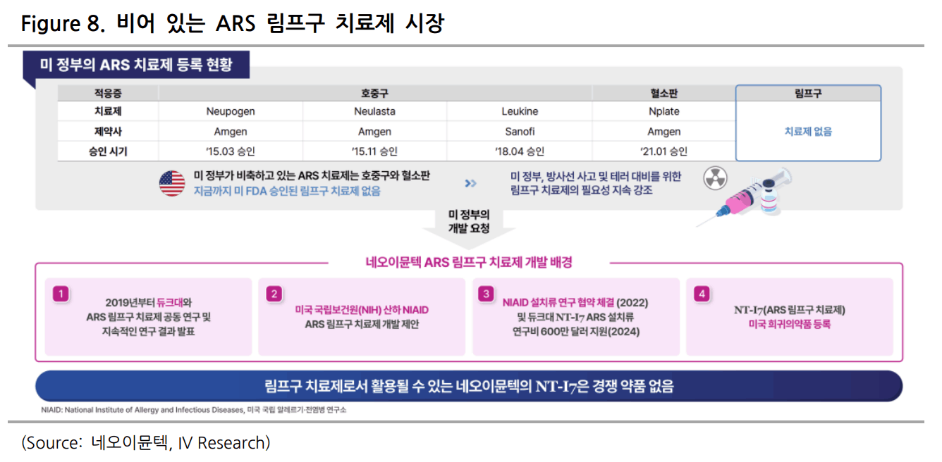 NT-I7이 ARS 치료제로 승인될 경우, 이는 세계 최초의 림프구 표적 ARS 치료제가 탄생하는 성과가 될 전망이다. 현재까지 美 FDA 승인 림프구 치료제는 전무하기 때문에, NT-I7이 승인을 받으면 면역재건 분야의 미충족 수요를 충족하는 첫 약물이 될 것으로 기대된다. 더불어 美 연방정부 비축용 치료제로 납품에 성공할 시, 이를 레퍼런스로 하여 유럽 등 시장으로 확대가 가능할 전망이다.