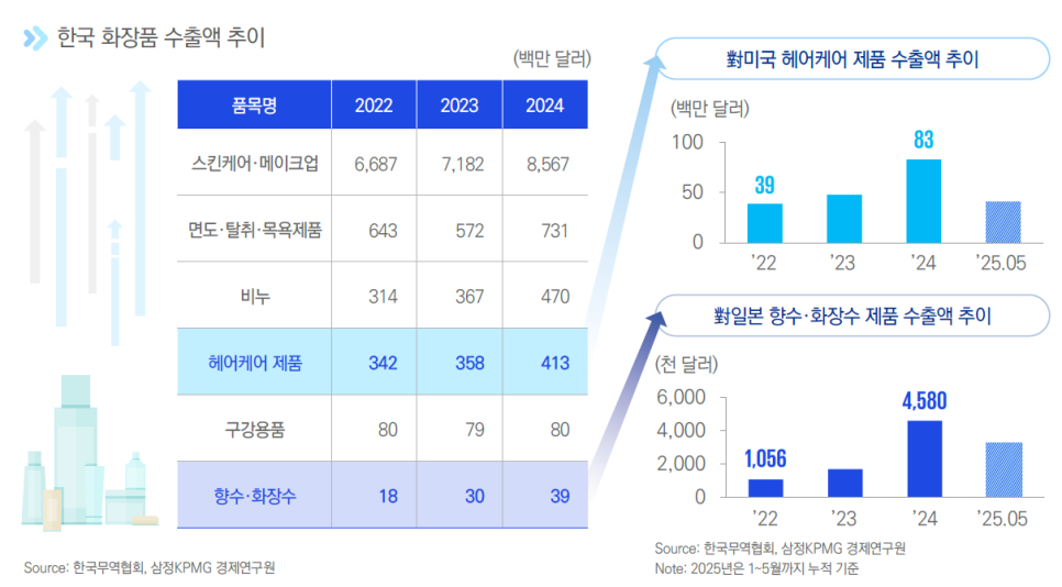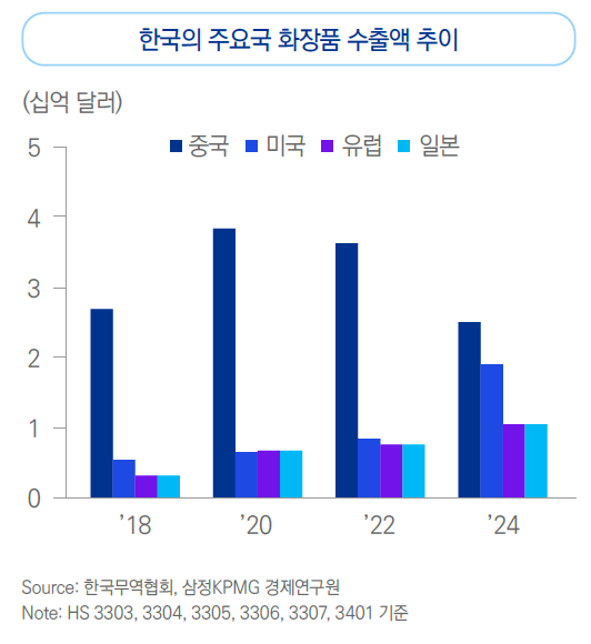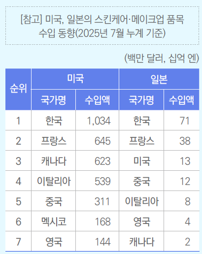 미국과 일본의 화장품 수입 중 스킨케어/메이크업 품목은 이미 프랑스를 제치고 대한민국이 수입 규모 1위 등극