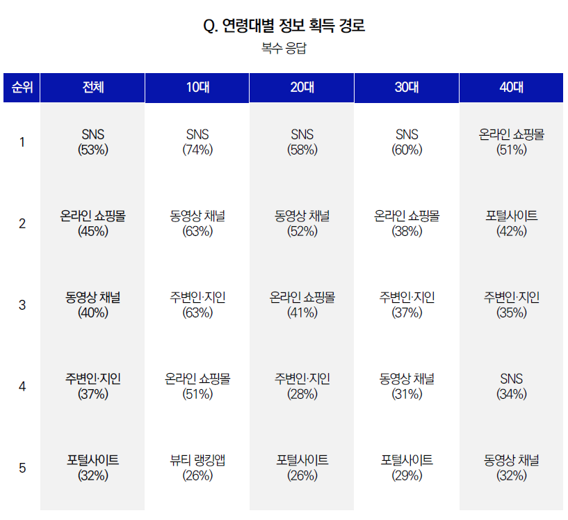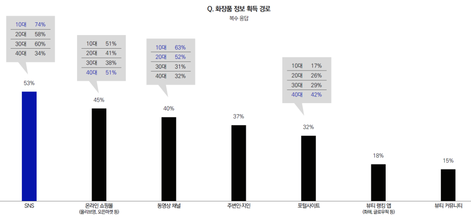 40대를 제외한 10대/20대/30대는 모두 SNS를 통해 화장품 제품 정보 획득