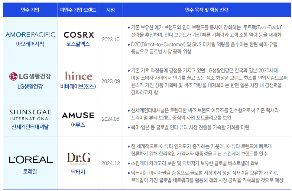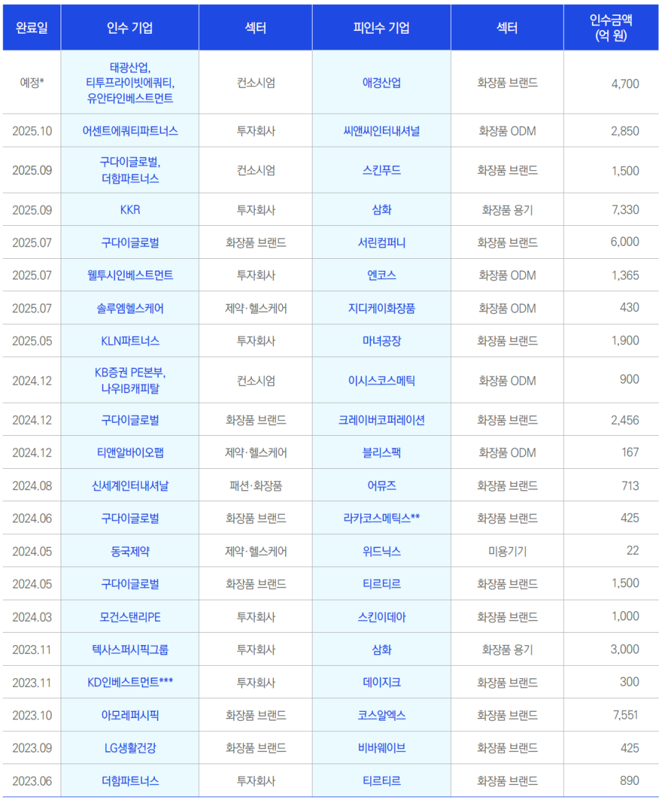 우려되는 점은 이 산업에서 기업 공개나 경영권 매각이 잦다는 것이다. 화장품 업종에서는 2023년 마녀공장, 2024년 에이피알, 그리고 2025년에는 달바글로벌이 상장을 했다. 큰 기업들만 이 정도고 중소형주는 더 많다.