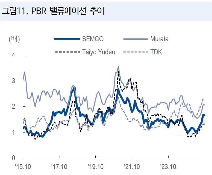무라타와 타이요유덴은 평소 PBR 2배~3배를 꾸준히 받아왔는데, 삼성전기만 PBR 2배가 비싸다는 건 적절한 평가는 아닐 것. 무라타는 영업이익율이 더 높다고 쳐도, 타이요유덴은 삼성전기와 영업이익율 차이도 없음