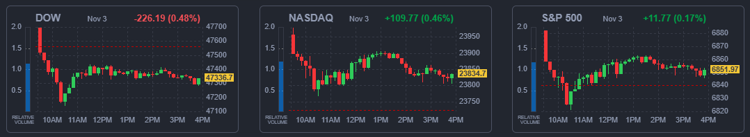 3일(미국 동부시간) 뉴욕증권거래소(NYSE)에서 다우존스30산업평균지수는 전장보다 226.19포인트(0.48%) 내린 47,336.68에 거래를 마감했다.