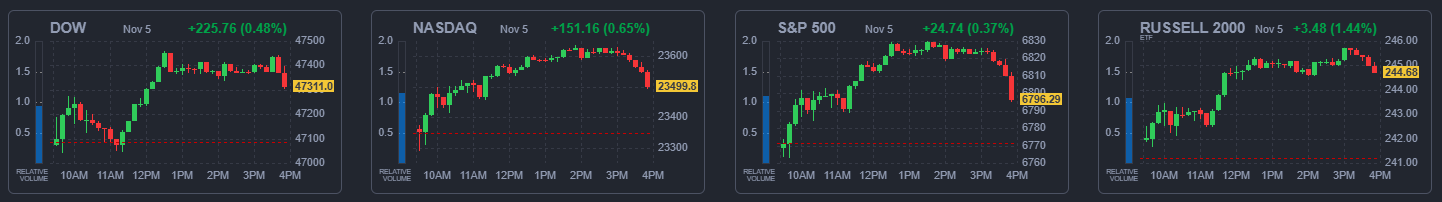 5일(현지시간) 뉴욕증권거래소(NYSE)에서 다우존스30산업평균지수는 전일 대비 225.76포인트(0.48%) 오른 47,311.00에, 스탠더드앤드푸어스(S&P)500지수는 24.74포인트(0.37%) 상승한 6,796.29에, 나스닥종합지수는 151.16포인트(0.65%) 뛴 23,499.80에 각각 거래를 마쳤다.