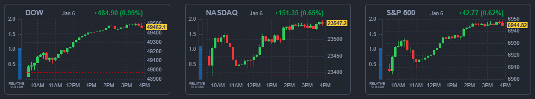 6일(현지시간) 뉴욕증권거래소(NYSE)에서 다우존스30산업평균지수는 전장보다 484.90포인트(0.99%) 뛴 4만9462.08에 거래를 마감했다. 스탠더드앤드푸어스(S&P)500지수는 42.77포인트(0.62%) 상승한 6944.82, 기술주 중심의 나스닥종합지수는 151.35포인트(0.65%) 오른 2만3547.17에 각각 장을 마쳤다. 이날 S&P500지수와 다우지수는 또다시 사상 최고치를 새로 썼다.