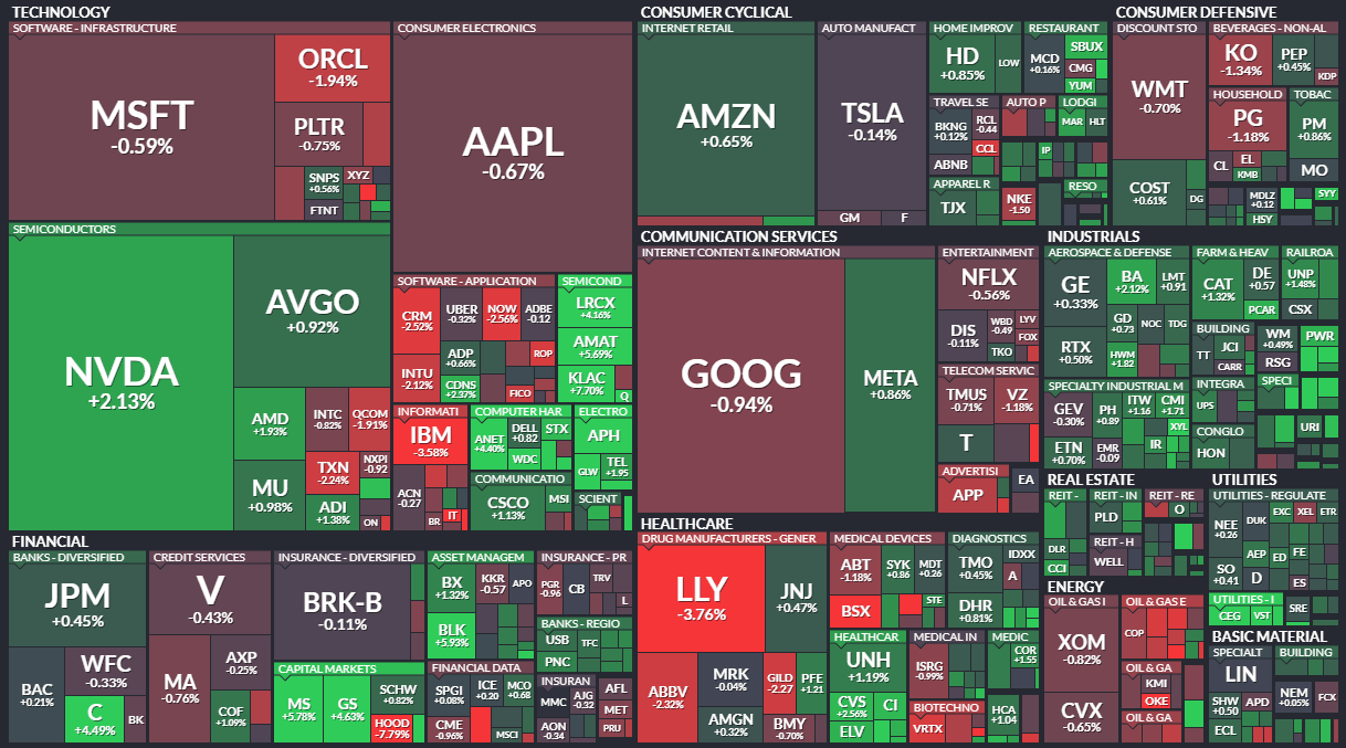 은행주도 실적 모멘텀이 이어지며 강세를 보였다. 골드만삭스는 4분기 순이익이 시장 예상치를 웃돌며 4.63% 상승했고, 모건스탠리는 자산관리 부문 실적 개선에 힘입어 5.78% 급등했다. 두 종목 모두 52주 최고가를 경신하며 금융주 전반의 투자심리를 끌어올렸다.