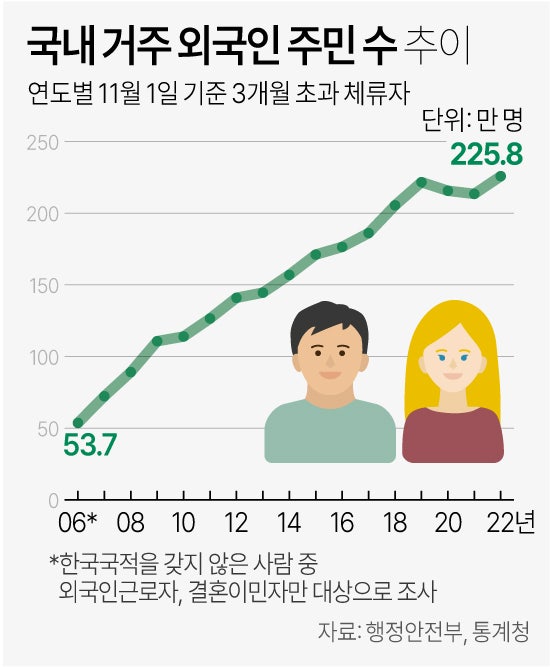 22년 기준 외국인노동자는 벌써 225만 명이 됩니다.