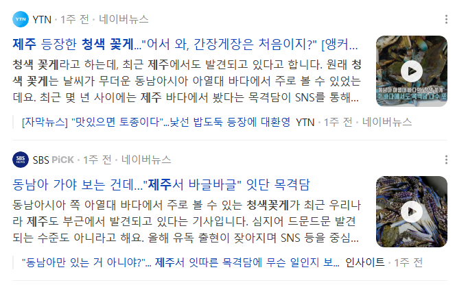 제주도에 청색 꽃게가 대규모로 등장했다는 기사가 나고 있다.