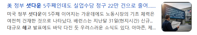 19. 셧다운이 5주째인데도 실업수당 청구가 22만건으로 줄어들었다는 기사가 나옴.