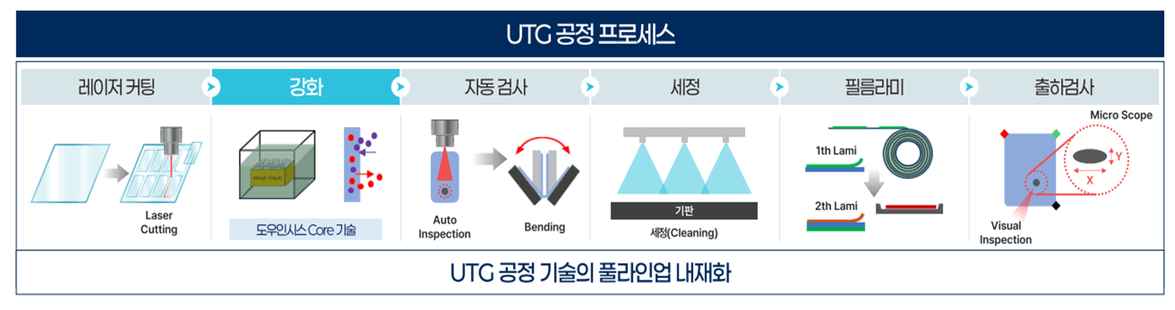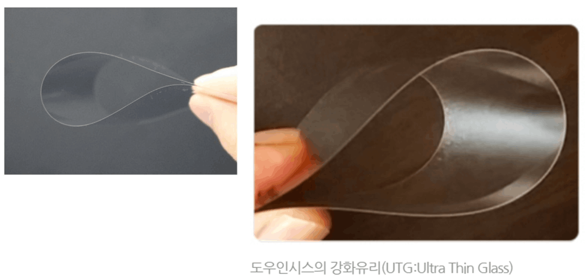 UTG란? Ultra Thin Glass의 약자, 초박형유리로 불림. 30~100㎛ 두께 유리원장을 가공하여 OLED 패널위에 합착하며, 심미성/시인성이 우수하여 기존의 폴더블 커버유리소재인 CPI를 빠르게 대체하고 있음(상세 이미지 아래 참고)