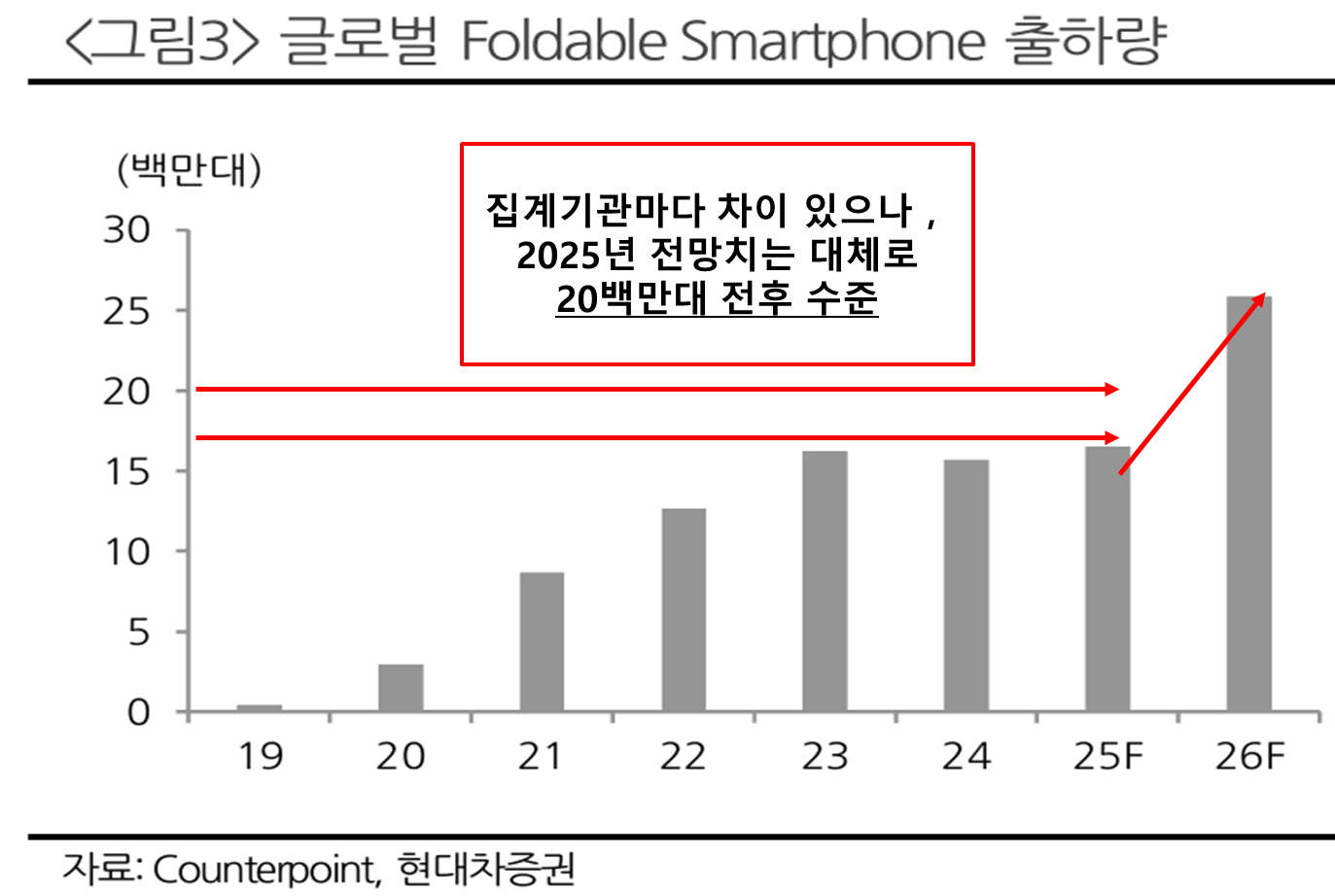 - 2024년 기준 총시장 폴더블 출하량 약 20백만대 수준 형성 → 2026년 출시하는 경우 10백만대 전후 전망 (by 디지타임스, 니케이, 트렌드포스, 카운터포인트, 옴디아, 국내외 증권사 등)
