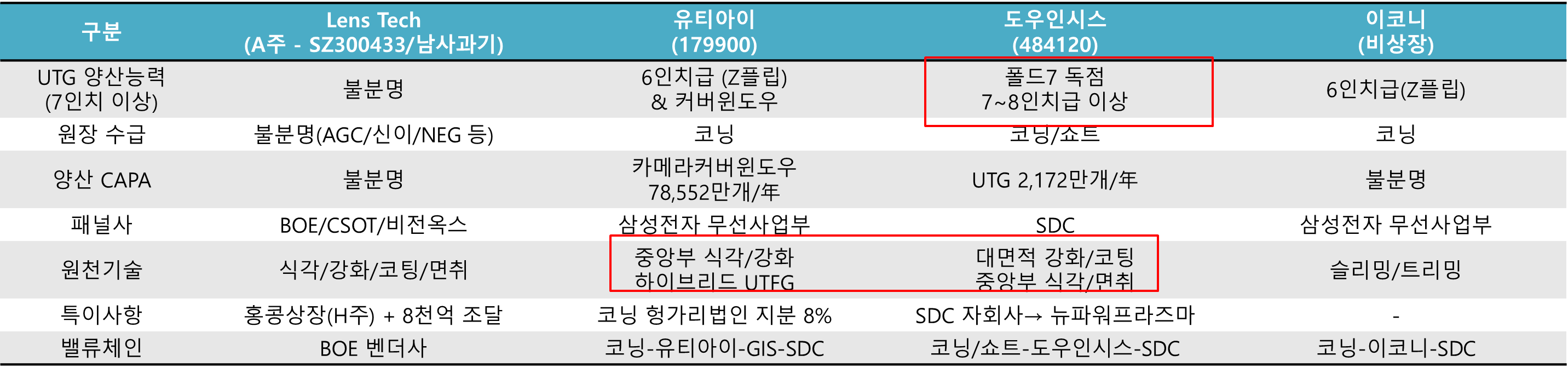 - 한편, 폴드7에 도우인시스가 코닝/쇼트 유리원장을 모두 사용하며 '코닝=유티아이, 쇼트=도우인시스' 공식은 깨짐. 세부공정 단계, 방식차이가 있으나 중앙부 식각에 관한 특허도 도우인시스가 등록하며 커버업 가능하다는 점을 시사