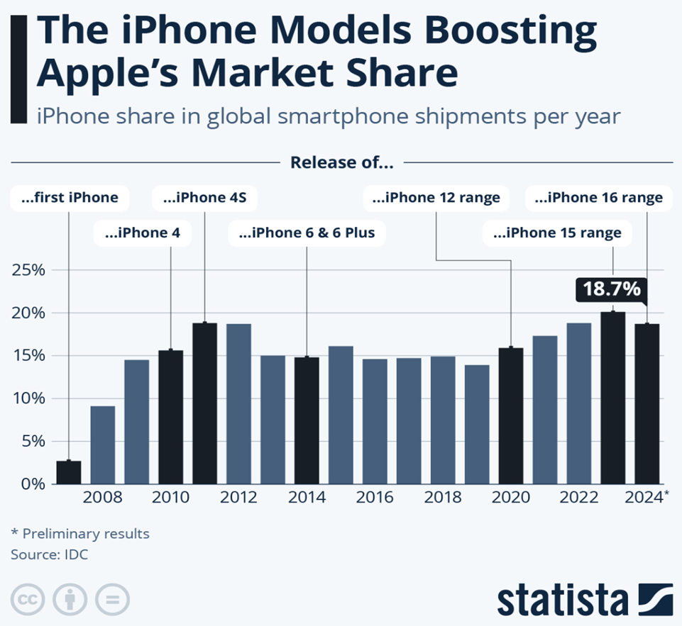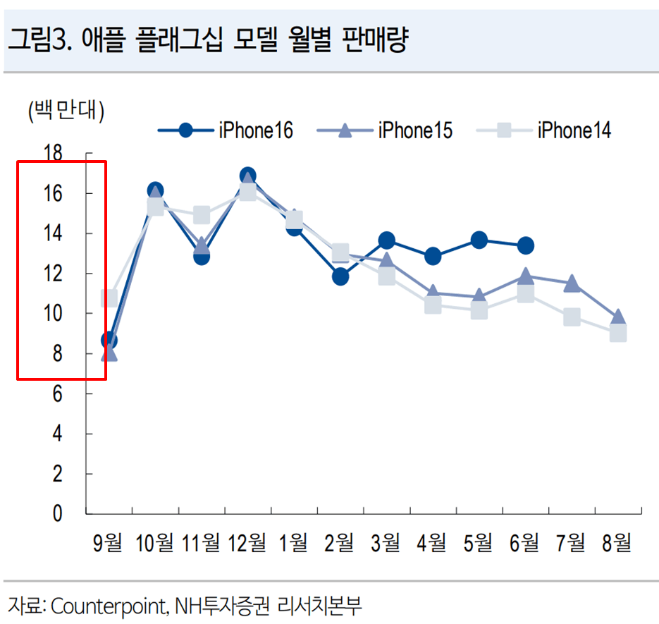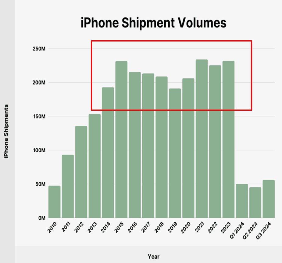 - 애플 아이폰 출하량 점유율 피크는 2023년 18.7%, 2014년 이후 약 2억원대 초반선에서 장기간 박스권 형성