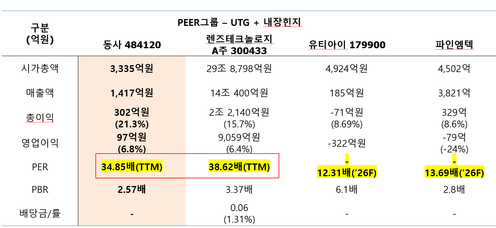 - 국내외 UTG 피어그룹 : 동사와 렌즈테크는 35배선(TTM), 반면 국내 관련사들의 26년 FWD PER는 12~13배(컨센서스 제시한 하우스 자체가 부족하고, 대부분 단순한 가정)
