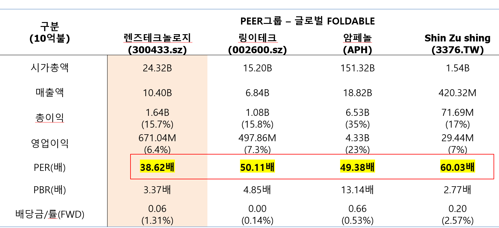 - 국외 폴더블 밸류체인 피어 : 규모면에서 비교하기 어려우나, 40배를 상회하는 수준