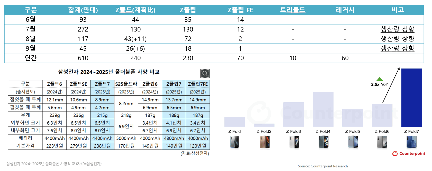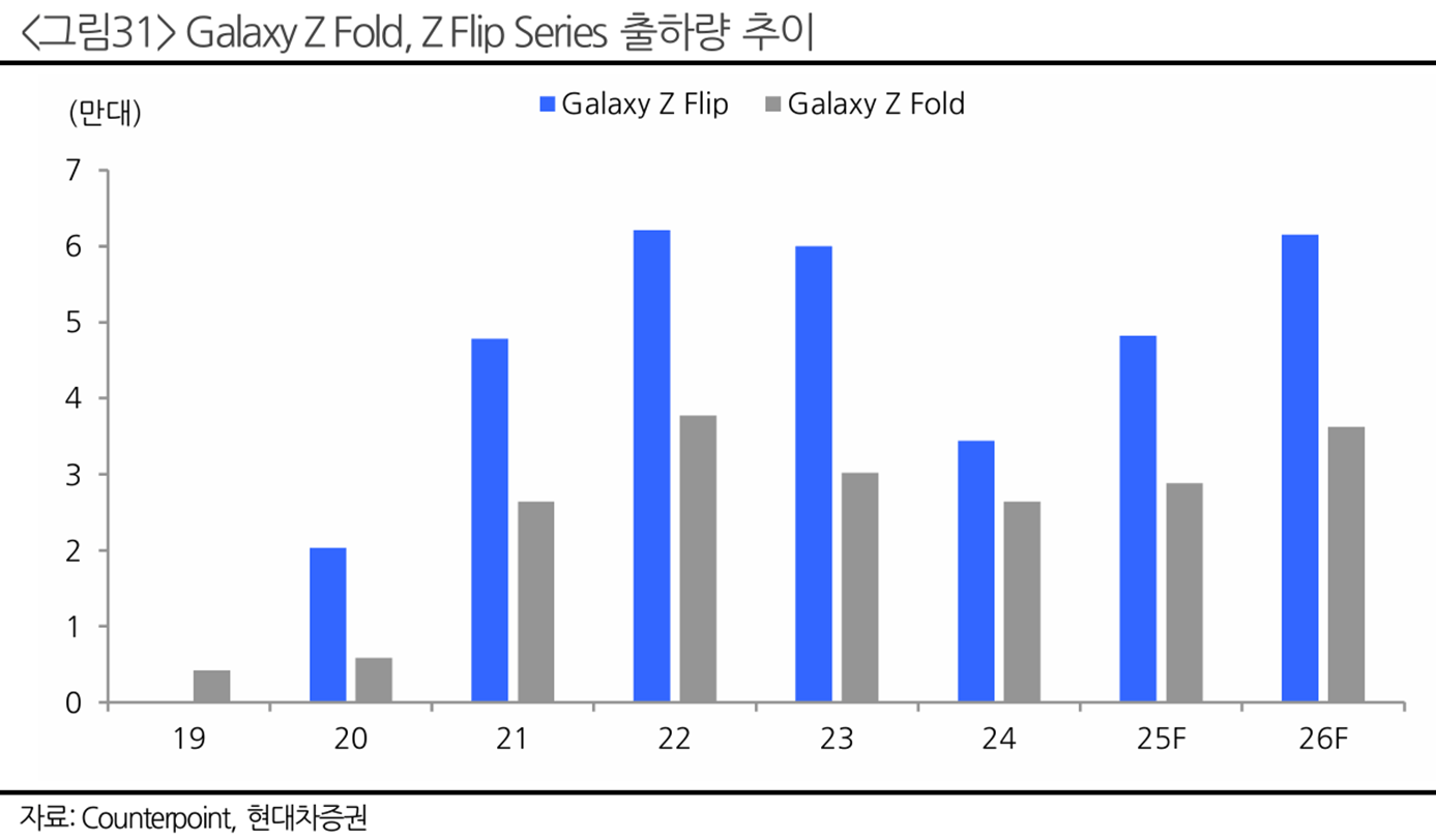 - Z폴드 240만대, Z플립 230만대, Z플립FE 70만대, 트리폴드 10만대, 레거시(폴드5~6) 60만대