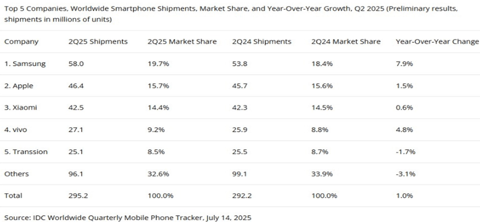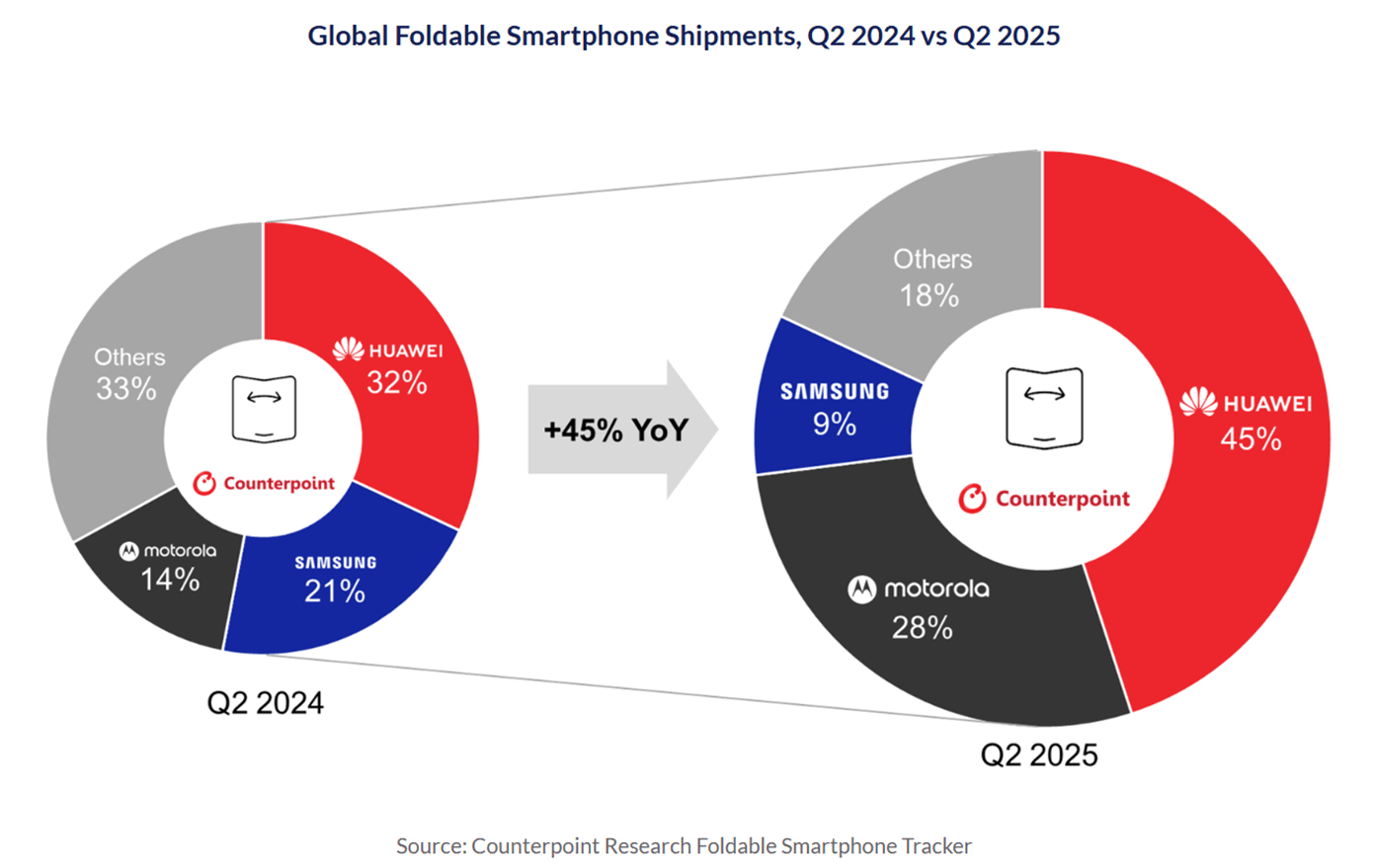 - 2025년 2분기 기준 화웨이, 모토로라 약진, 삼성은 폴드5 이후 부진을 면치 못하는 중